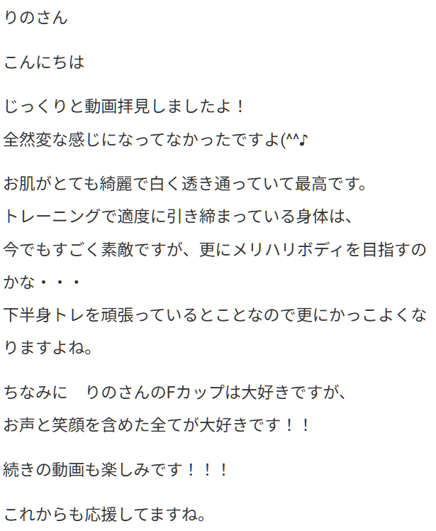 初めまして、りのさんのショート動画を見て、惹かれて、YouTubeのチャンネル登録しました。 美しい方でトレーニングの声が良き良き だから 全てを見たいと言う欲望とYouTubeでは露出を少なくして欲しいと言う理性が、仕事でギリギリ間に合わないかも知れないがYouTubeを見て、コメントして、高評価していきます。